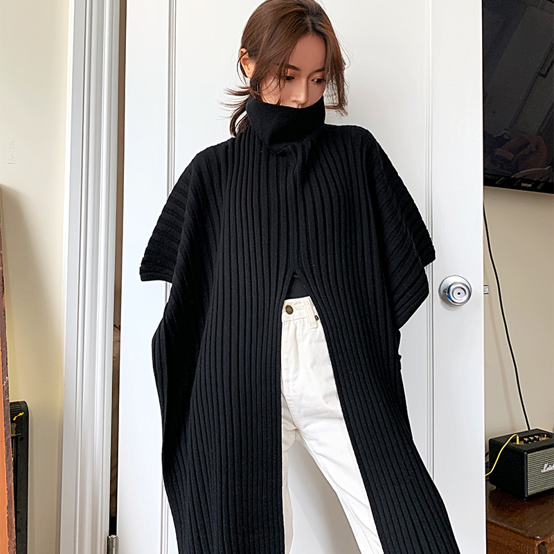 ABchic by AB 蝙蝠袖毛衣女秋冬高领不规则黑色开叉斗篷针织上衣