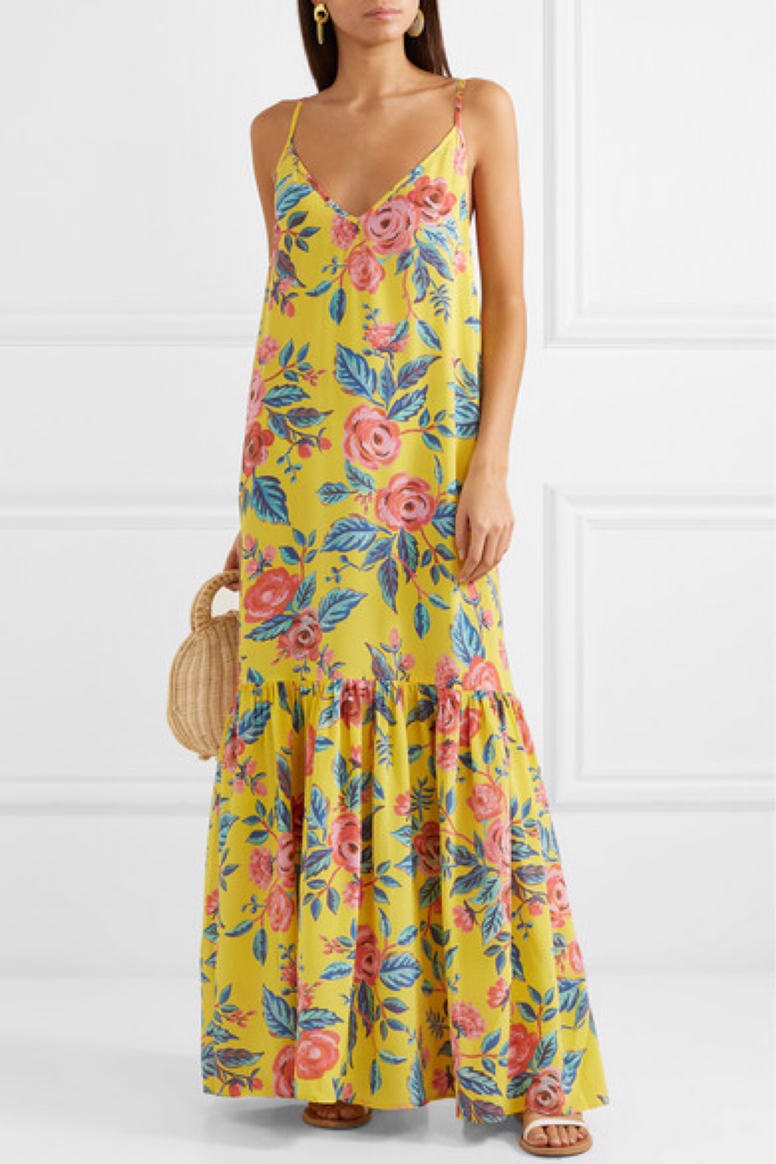we are LEONE 系列的设计灵感源自创始人 Rufus Isaacs 姐妹从母亲那儿借来的沙滩袍。这款 “Elke” 连衣裙裁自飘逸的真丝双绉,印有鲜艳的花卉图案,褶裥细节营造出起伏的裙摆,更添一分柔美。