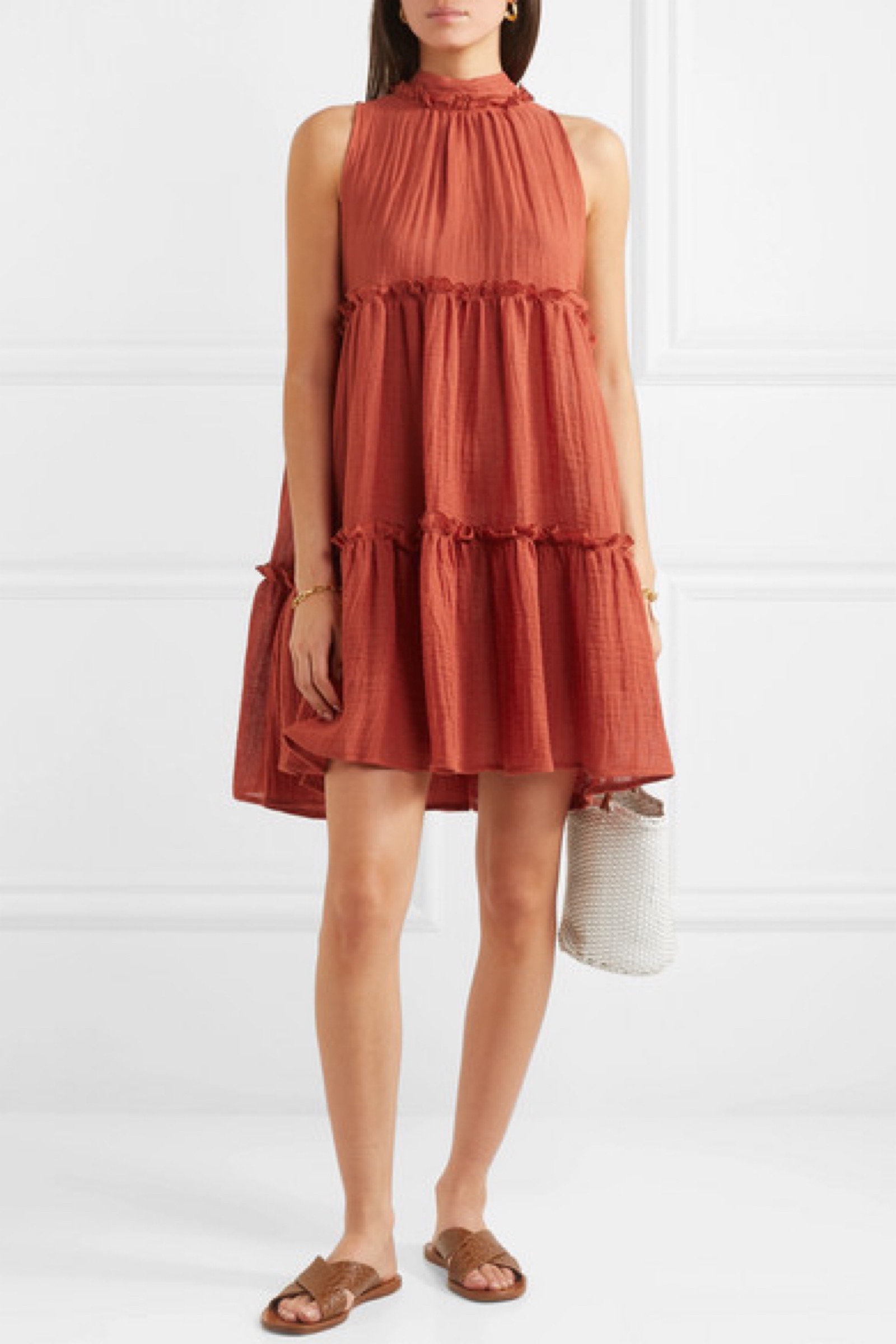 Lisa Marie Fernandez 这款 “Erica” 迷你连衣裙可说是度假服饰的绝佳首选。单品以透气的亚麻混纺面料层接剪裁而成,粉橘色调与各种肤色相得益彰,浪漫的荷叶边和颈部系带则增添了青春活力。它的廓形宽松,尽管温度飙升,亦能令你感到凉爽舒适。