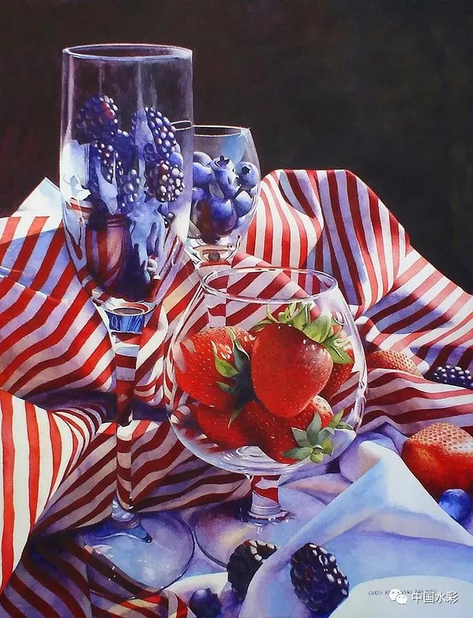 克里斯是美国水彩协会的签名成员,并于2015获得了海豚奖。她也是国家水彩协会、洛基山水彩协会、透明水彩学会的大师级会员、以及一些艺术团体里的代表人物。克里斯的水彩画创作特别考虑细节。通过把她大部分的注意力集中在最小的细节上,观众被吸引到她作品的细节中去。动态光影处理是她绘画中的突出表现,明暗的使用使她的作品有一种抽象设计,她很好的利用了这两个要素,使她能够创作出充满生命力的静物和大胆的作品。