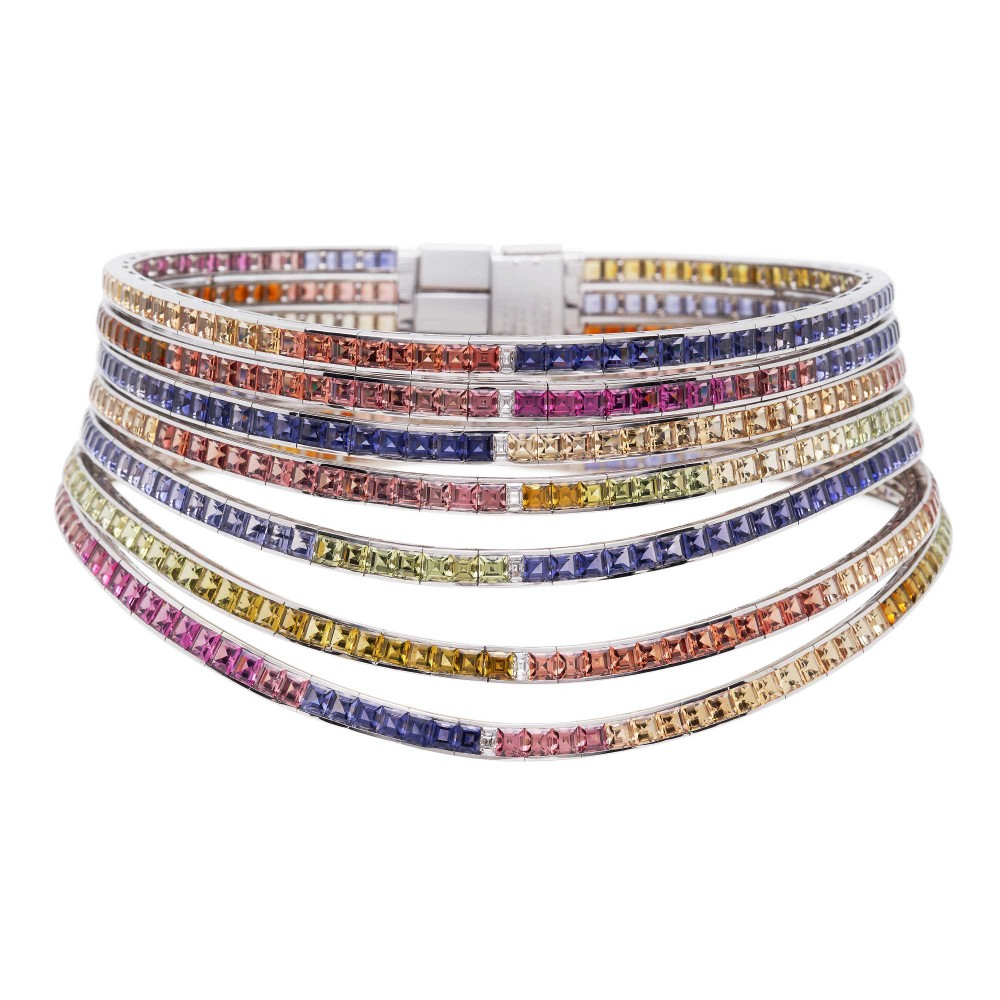 设计师在这件作品中使用了5种不同颜色的彩色宝石——粉色碧玺,红色石榴石、橘色托帕石、绿色碧玺和紫色堇青石,温暖明亮的色调让人联想到太阳初升时的朝霞。