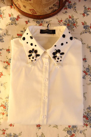卡密拉镶钻简约蝴蝶刺绣宝石领衬衫 厚雪纺白色打底内搭衬衫