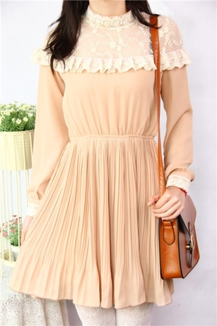 彼得潘松紧腰小清新雪纺百褶复古文艺范vintage长袖连衣裙