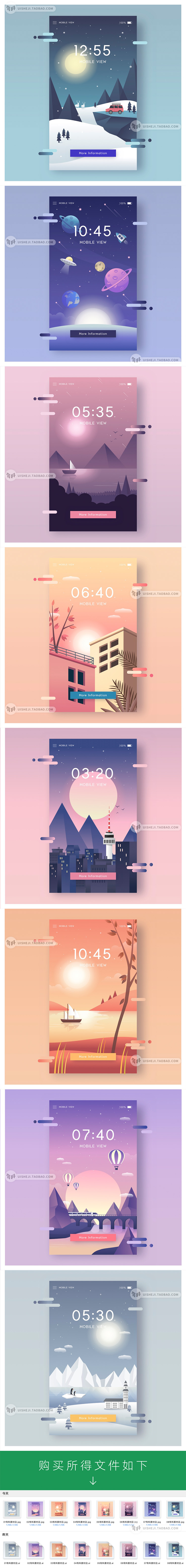 扁平化山峰星空简约山脉天气风景AI矢量手机插画背景设计素材S336