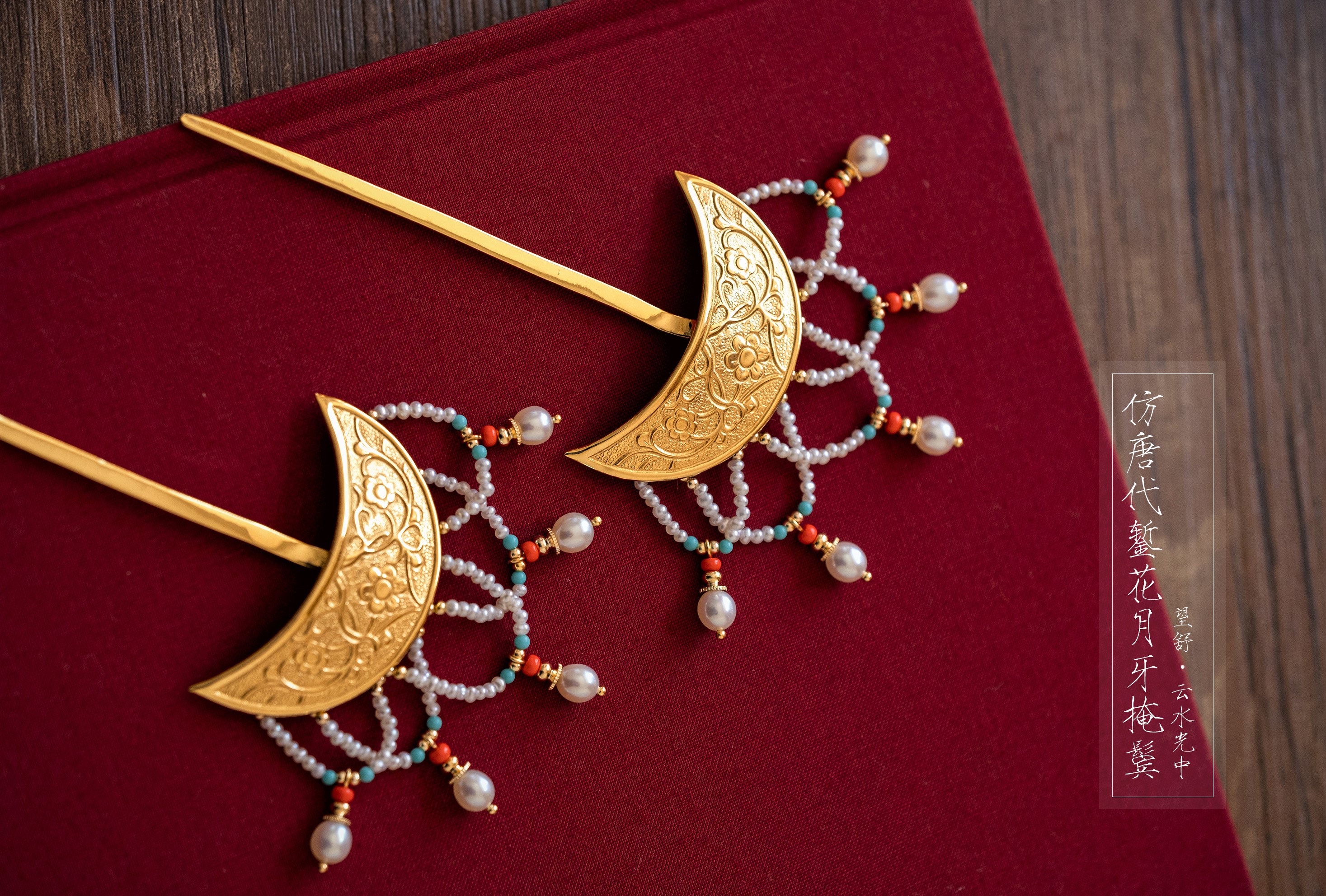 【发簪】银镀金唐风簪刻唐草纹珍珠流苏掩鬓发簪 - 『云水光中』