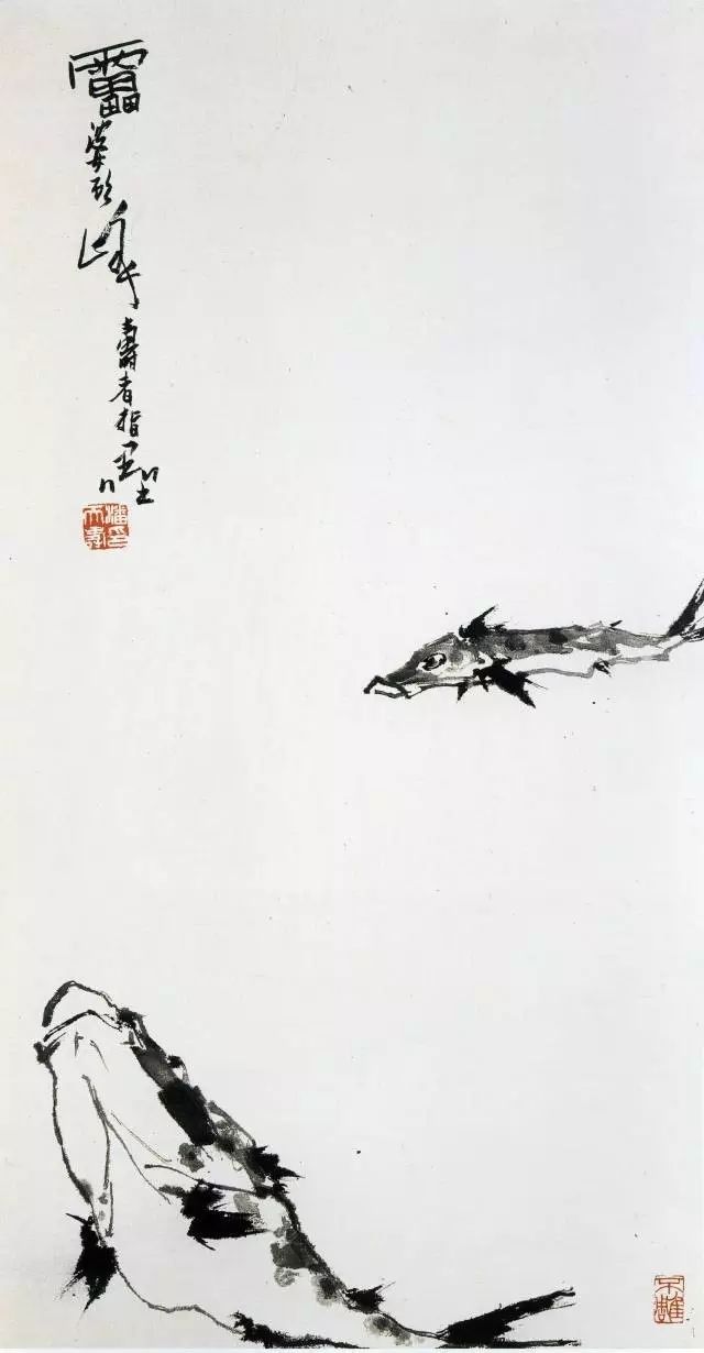 潘天寿《鱼乐图轴》,中国画(指墨),108×57.5cm,1962年