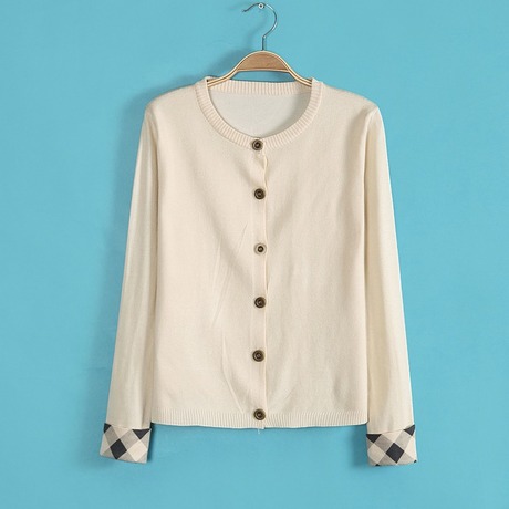 新款卷袖格子纽扣纯色纽扣开衫