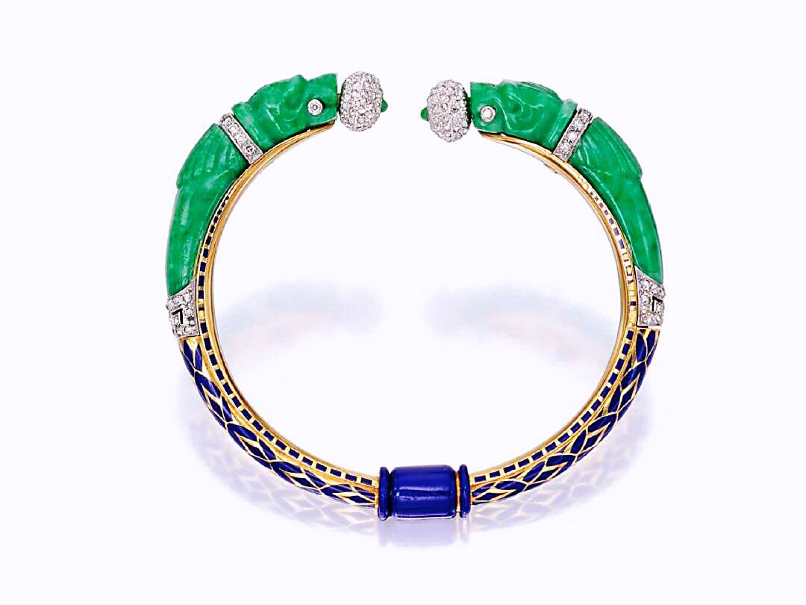 大概在上世纪Art Deco珠宝盛行时期开始,卡地亚、梵克雅宝、宝格丽等珠宝世家就有推出这样一种款式的手镯,它们不仅有古希腊、古代伊特鲁里亚风格影响,也吸收了很多东方元素,以兽首衔接,色彩艳丽,用各类宝石制作,常被称为chimera手镯。