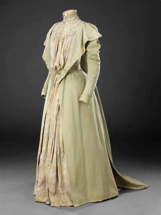 丝缎的披风。为波切恩制作的书页中体现了紧身的生命。从肩缝沿着领口和生命的顶端插入,在那里融合到西马伦的下半部分。生命的背部和正面都有蕾丝装饰。袖子光滑,一直延伸到肘部。素白帆布衬袖。蓝白条纹帆布衬衣生命。