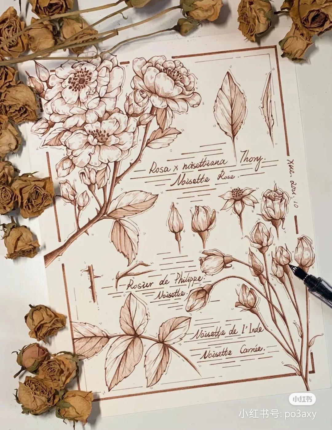 白描线描花卉与鸟