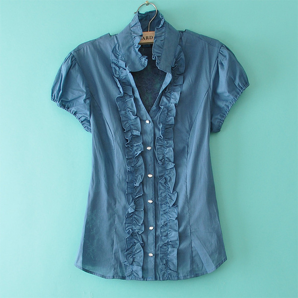 T463外贸原单 日系公主木耳边蕾丝钻石扣短袖衬衣 衬衫4色