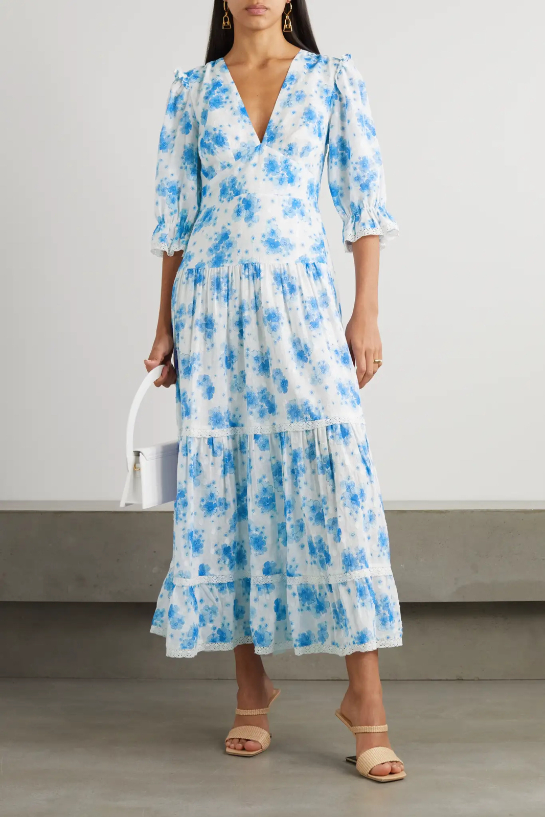 RIXO 服装上的印花均在品牌的伦敦工坊以手工绘制,这款 “Adelaide” 中长连衣裙上雅致的花卉图案也不例外。本单品以圆点提花纯棉面料裁就,泡泡袖丰盈灵动,点缀有蕾丝边饰的层接式裙摆清新甜美。穿着时不妨搭配中性色凉鞋和首饰。