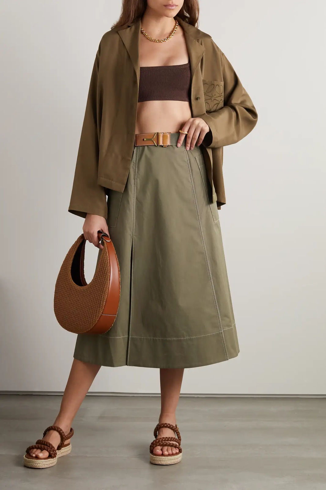 Loro Piana 这款半身裙低调而精致,可谓有着不过时的经典魅力。它采用亚麻、羊毛和真丝混纺面料制成,带有天然的纹理质感。褶裥与腰间系带穿着效果。