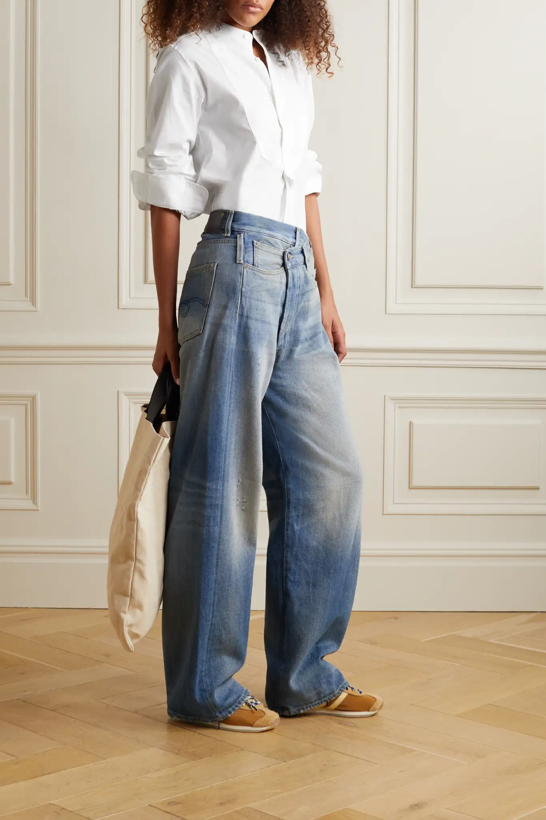 B Sides 这款 “Elissa” 高腰阔腿牛仔裤诞生于美国一座家族经营的工坊,质感硬挺,猫须刷纹和褪色设计致敬了品牌创始人 Claire Lampert 和 Stacy Daily 热爱的古着服饰。