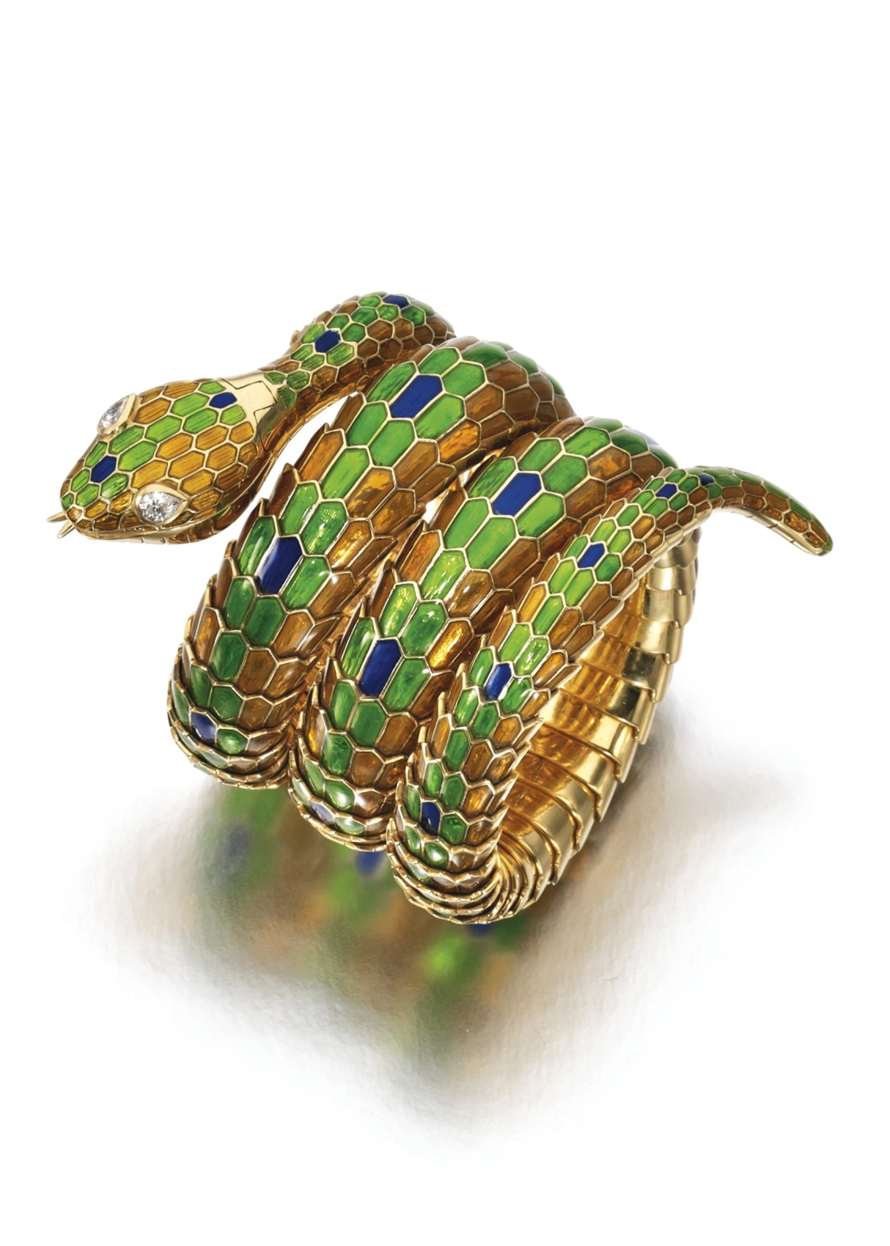 宝格丽的腕表,蛇形设计,饰以蓝色、绿色和黄色珐琅,眼睛镶嵌梨形钻石,开口露出圆形表盘