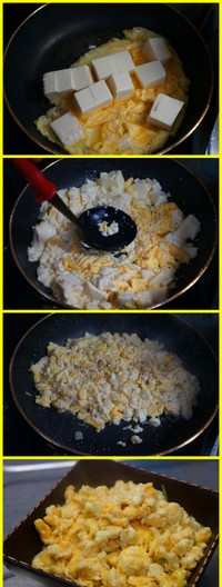 【金包银】超级简单,鸡蛋打散炒到锅中间的蛋液还没有完全凝固,放内脂豆腐进去,然后用勺子把豆腐按碎,边按边搅拌,让蛋液都包裹在豆腐上,放盐,胡椒粉中火小烧片刻,最后出锅前淋几滴香油就好了,你说算素菜还是荤菜?这个叫金包银,最后淋入大量的辣油又可以称为鸡刨豆腐。