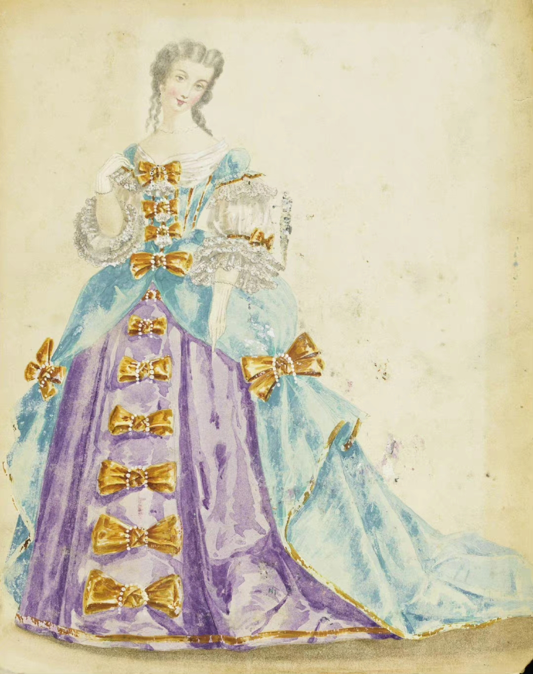 维多利亚与阿尔伯特博物馆收藏19世纪中叶,来自worth时装屋的化妆舞会服饰手稿。在 1860 年代,法国时尚缪斯欧仁妮皇后举办了许多奢华的化装舞会,舞会上的宾客们都会穿着由worth设计的极具创意性的服饰,这些服饰中,有精灵天使、也不乏洛可可式的妩媚婀娜,甚至有些还有古老的巴比伦、腓尼基元素。 ​​​