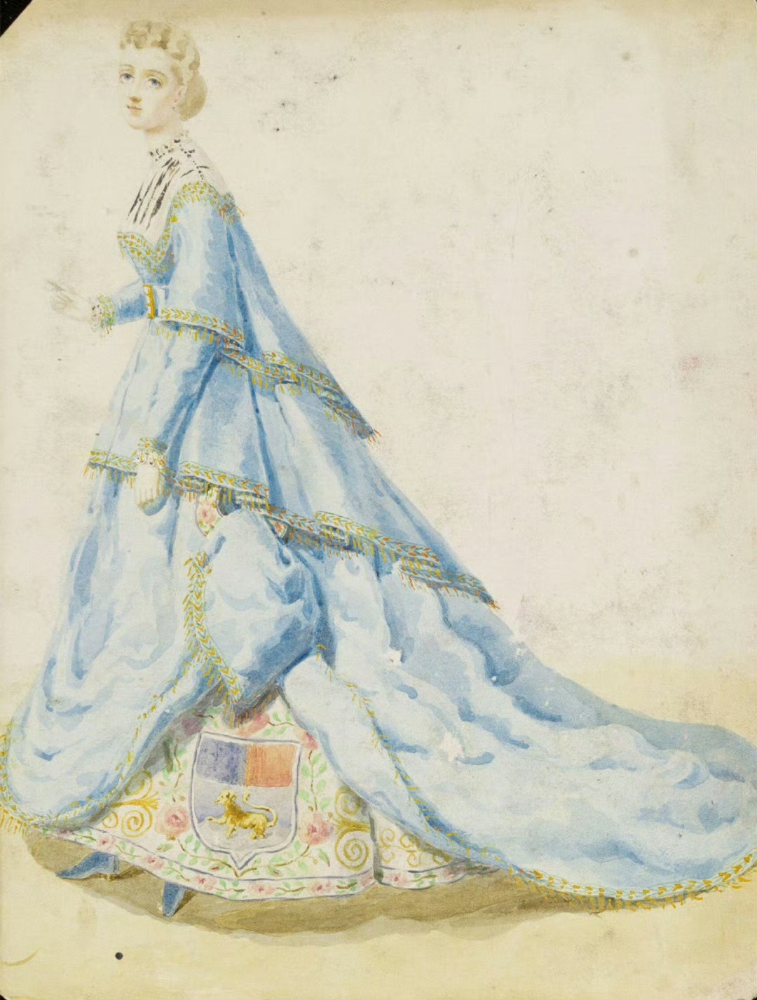 维多利亚与阿尔伯特博物馆收藏19世纪中叶,来自worth时装屋的化妆舞会服饰手稿。在 1860 年代,法国时尚缪斯欧仁妮皇后举办了许多奢华的化装舞会,舞会上的宾客们都会穿着由worth设计的极具创意性的服饰,这些服饰中,有精灵天使、也不乏洛可可式的妩媚婀娜,甚至有些还有古老的巴比伦、腓尼基元素。 ​​​