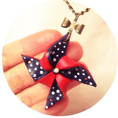红白蓝小风车吊坠温馨粘土项链