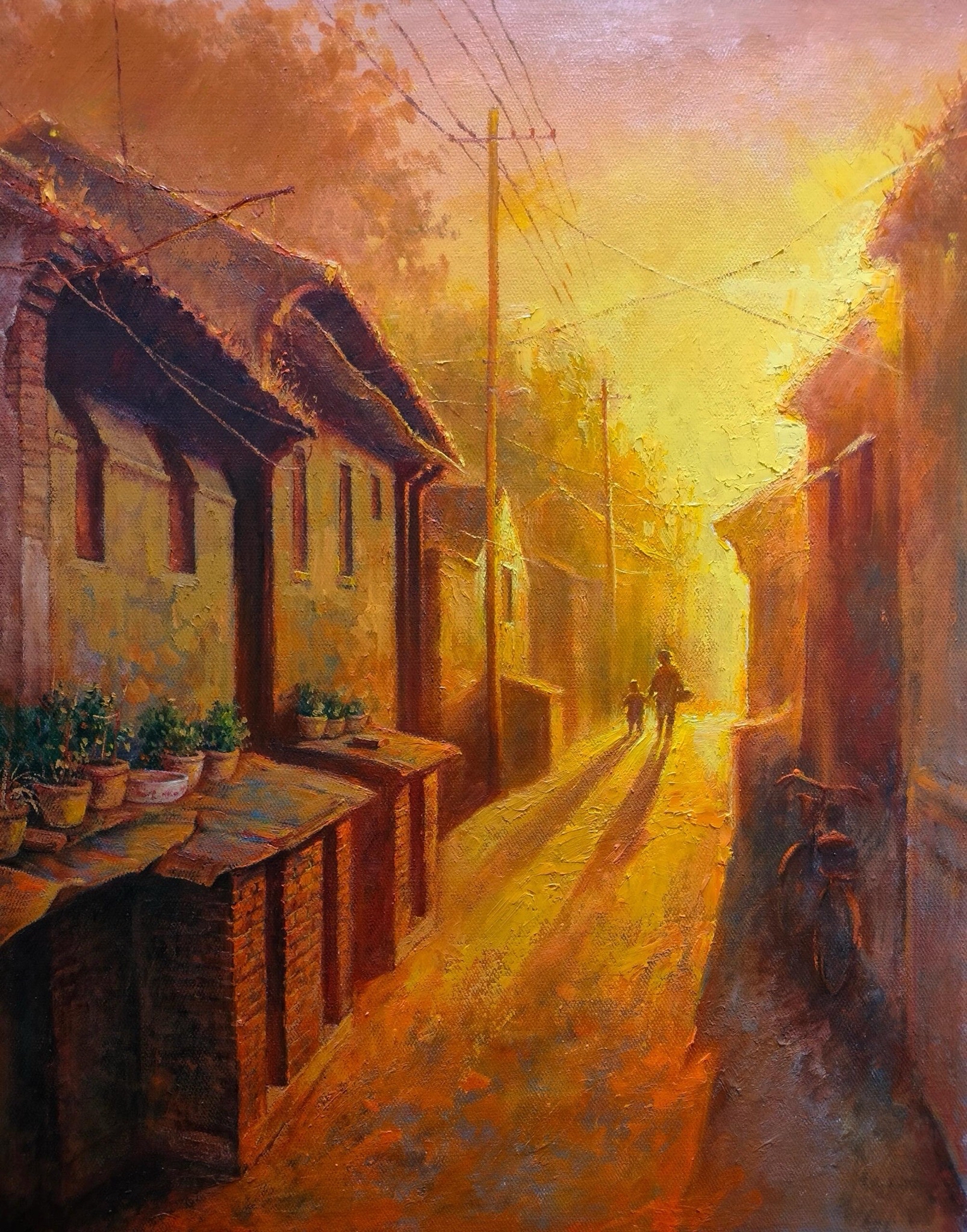 小巷深处,夕阳似金色流彩。屋顶的旧瓦,墙沿的盆栽,都沉浸在这金黄里。电线如记忆的丝线,纵横交错。大人牵着孩子,身影被余晖拉长,这是生活的画卷,晕染着平凡又珍贵的美好。