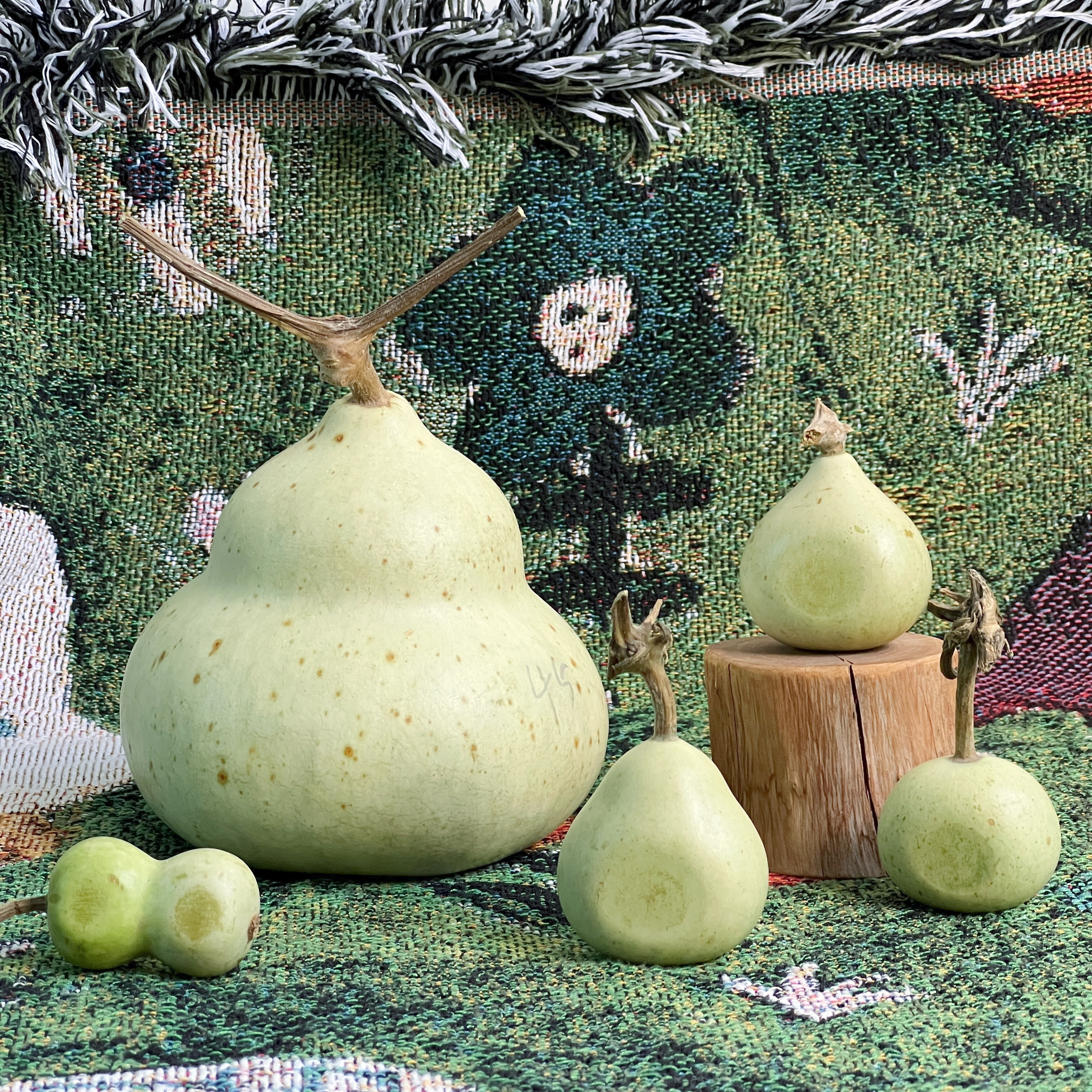 1、今年的青皮葫芦成熟了,从左到右依次是蝴蝶结扁、大天坛墩、小梨子扁、小栗子扁和小苹果扁