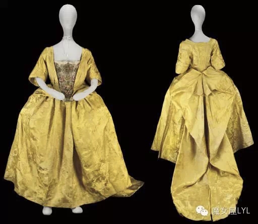 宫廷曼图亚的中国皇家黄绸锦缎,约1740年的丝绸,18世纪50年代的曼图亚紧身胸衣,长长的一排精心折叠的锦缎在背后的两个丝绸覆盖的纽扣上,紧身胸衣重新褶皱成一件封闭的长袍,衬裙重新串起