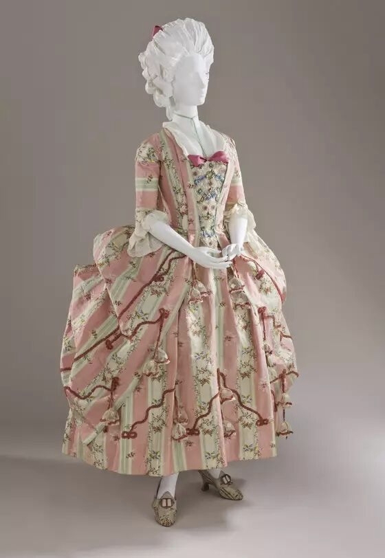 产地:英国,大约1760年 面料:丝绸平纹编织,纬纱浮雕图案和丝绸与金属线辅助纬纱图案和金属花边