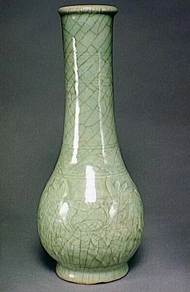 明代 龙泉窑青瓷刻花缠枝牡丹纹长颈瓶吉美国立亚洲艺术博物馆藏