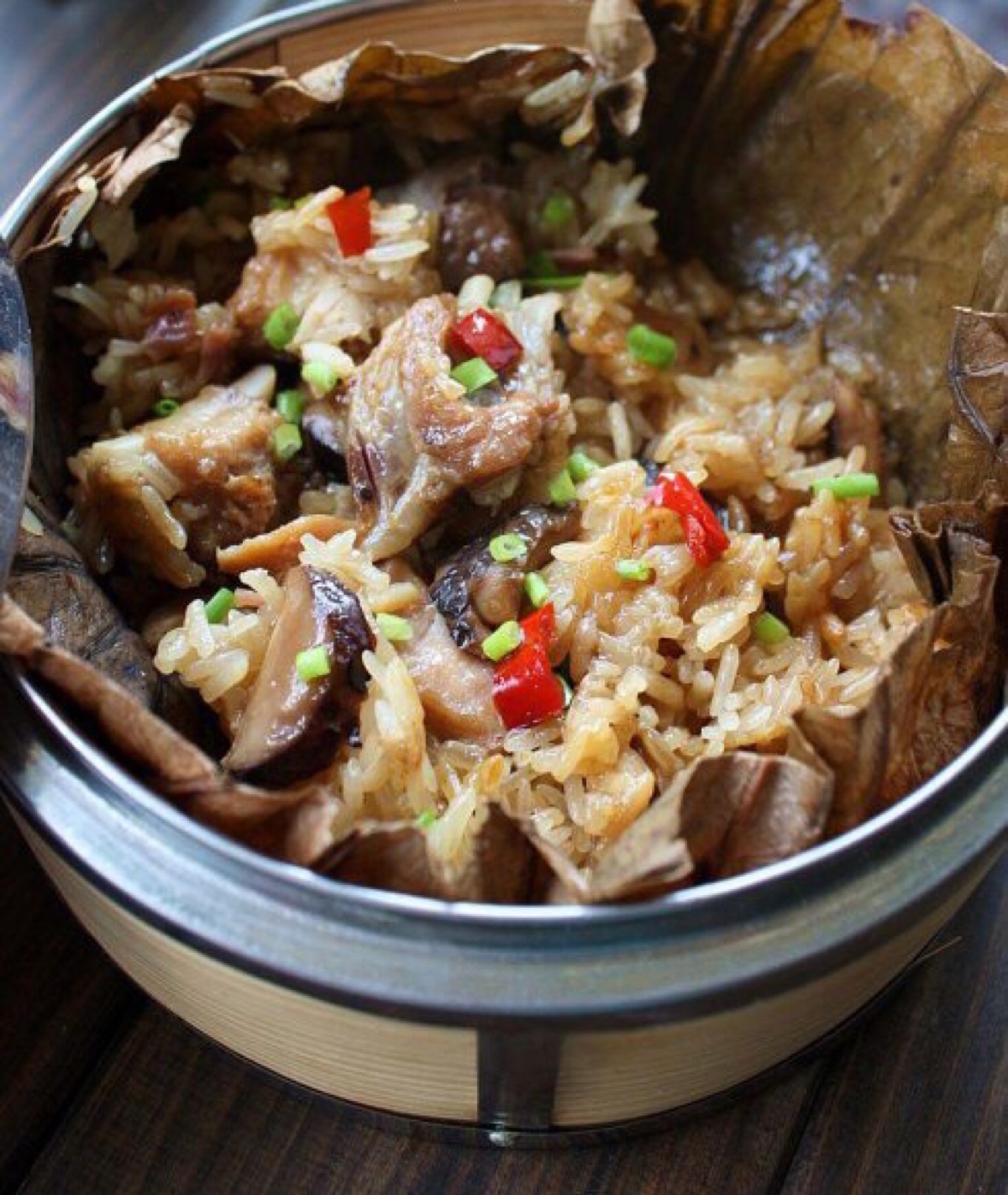 荷香糯米排骨:糯米400克、排骨200克、干香菇6朵、干荷叶4张、蚝油一小匙、生抽一大匙、老抽一大匙、料酒一小匙、白糖一小匙。排骨洗净血水.沥干.放入蚝油、老抽、生抽、盐、白糖、料酒、拌匀密封放入冰箱冷藏一晚上.糯米用清水浸泡一晚上.干香菇泡发切片.将腌制好的排骨中汤汁倒入糯米中拌匀.荷叶刷洗干净.打开在中间放入糯米.再放香菇片与排骨.盖上适量的糯米.包起来用耐热碗装起来.高压锅内放水.摆上蒸架.放装有荷叶糯米排骨的碗.盖盖.大火烧至冒汽后转中火蒸约40分钟后关火。