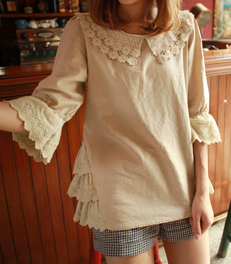 花边大翻领娃娃衫喇叭袖棉麻衬衫衬衣女 日系森女系14夏装