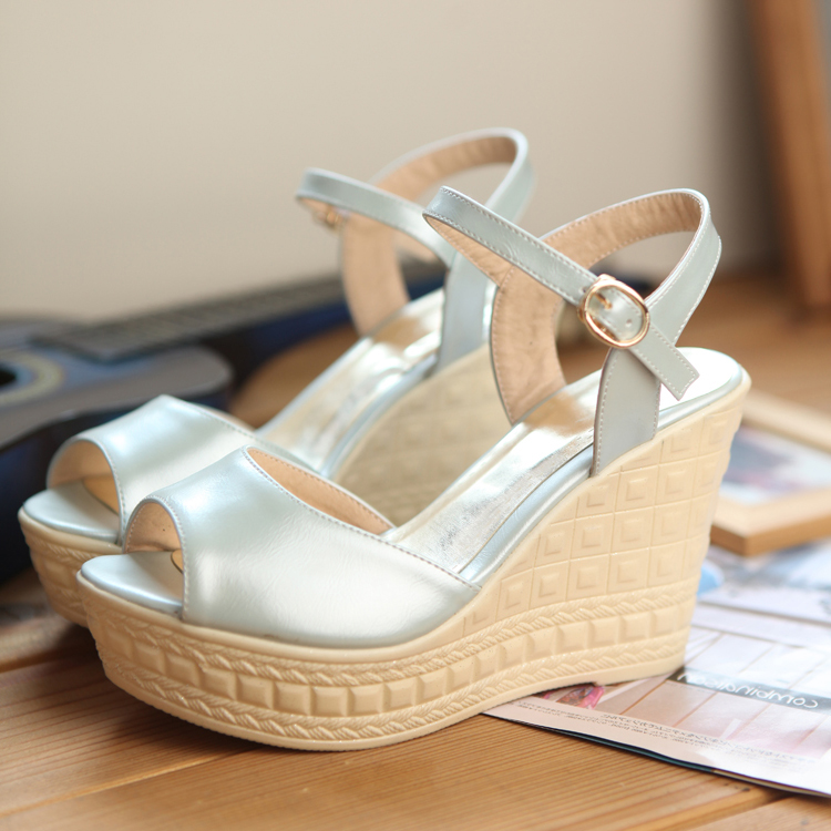 夏季韩版闪亮亮片坡跟厚底交叉绑带高跟露趾凉鞋淑女公主女鞋