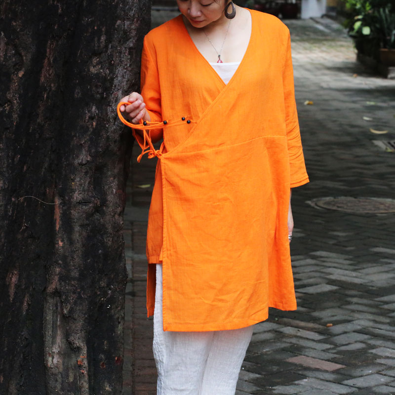 秋季橘色系带八分袖长衫女装开衫外套棉麻原创女装例外风格