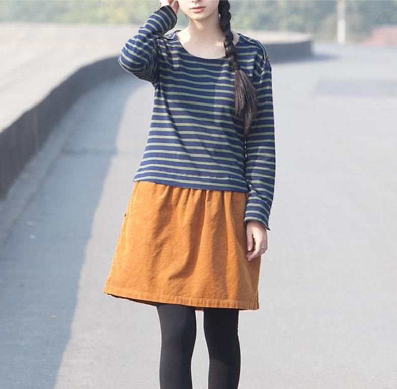 衣公馆 森林系文艺复古 灯芯绒条纹拼接 圆领文艺气质连衣裙