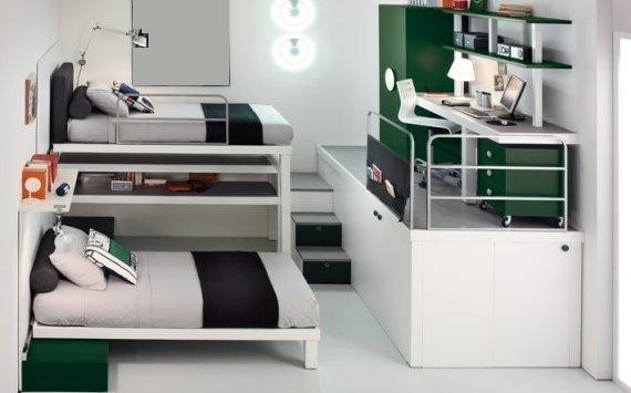 下面的床好像是可以收得~ 喜欢这种节约空间的方式~ 还有书桌下面的柜子 也很不错
