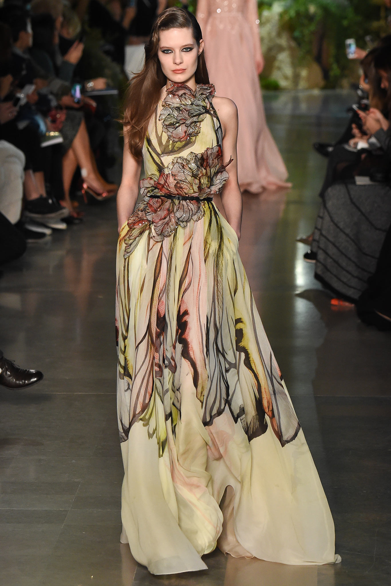 Elie Saab Spring 2015 Couture。艾莉·萨博2015春夏巴黎高级定制时装周在一片片绿色植被花丛中拉开帷幕。本季,以“忧伤的挽歌”向家乡贝鲁特致敬,Elie Saab以“花”为主题,重笔墨于轻盈的流苏与立体花朵装饰之上,结合他对美的深刻理解,用亮片刺绣点缀于薄纱中,轻绢曼纱、珠罗蕾丝,宛若花仙精灵,美得令人窒息。
