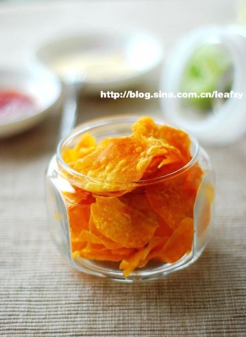 【香脆薯片】 原料:红薯2只、色拉油适量 做法: 1、将红薯去皮,切薄片,用厨房纸拭去水分 2、放入3成热的热油中小火慢炸,直到薯片周边变硬,呈金黄色 3、捞起沥油,冷却密封保存 Tips: 1、红薯片尽量切的很薄很薄,口感更脆 2、一定要小火,火大了则外焦里软 3、尽量蘸食,不要将番茄酱等一些液体状佐料拌薯片吃 4、用土豆炸薯片时,切过薄片的土豆需浸泡一下盐水,拭干后下锅炸 土豆片切好后应在热水中烫一下,速度快,熟了就不好了,再把土豆片晾晒一至两天,省去了厨房纸的步骤,然后小火慢炸,土豆片会相当的脆哦