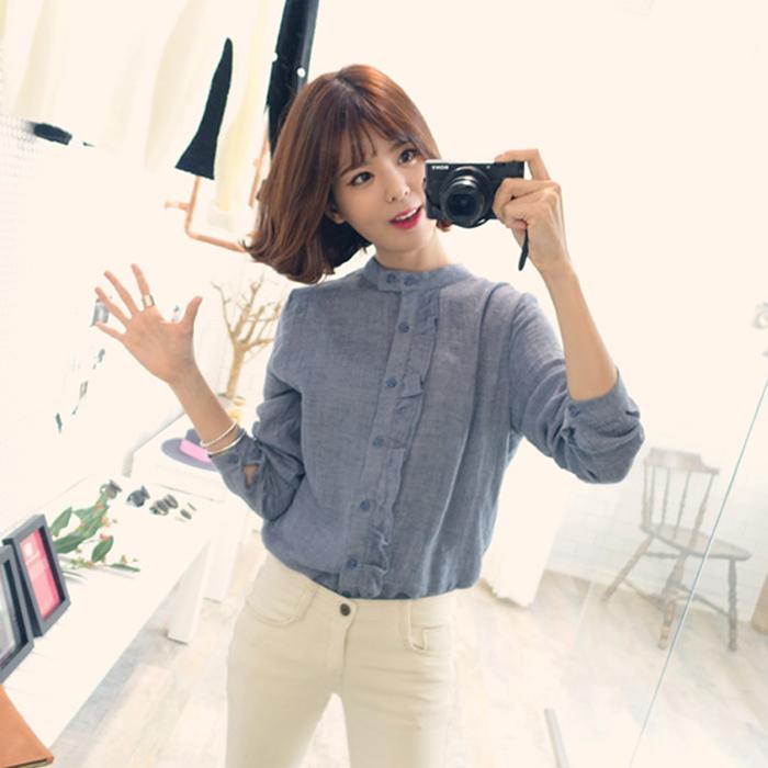 2015春装韩国爆款牛仔蓝圆领衬衫女中长款上衣