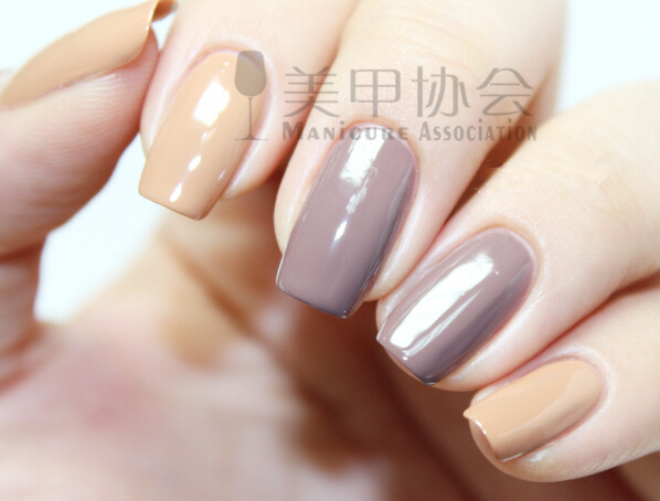 2、然后如图给各个指甲涂上相应的浅咖色跟米色,两遍哦