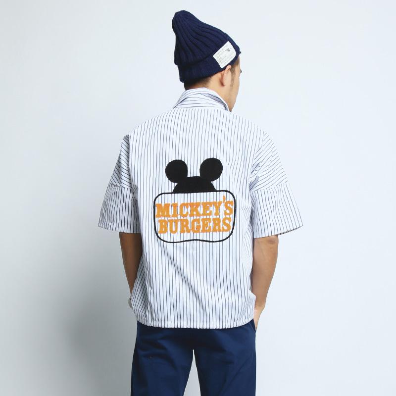 found!春夏 韩版宽松条纹后背米奇刺绣设计款男款抽绳衬衫