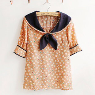 花开花落,海军风学院派蝴蝶结领结碎花衬衫 雪纺衫
