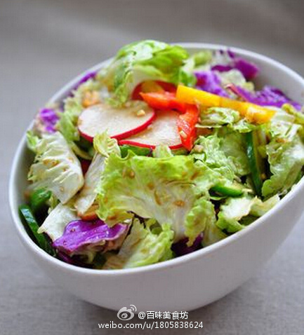 【大拌菜】1.用到的所有蔬菜洗净沥干水份2.生菜用手撕成小片,黄瓜、萝卜、彩椒切片、紫苷蓝切丝3.生抽加少许水、一点点盐、鸡精,放在锅里烧一下至盐和鸡精化开后关火,加入美极鲜味汁和绿芥末调匀。4.蒜切末,放在切好的蔬菜上,把调好的生抽汁浇上去,再加醋和一点点香油拌匀后加入麻辣花生装盘。