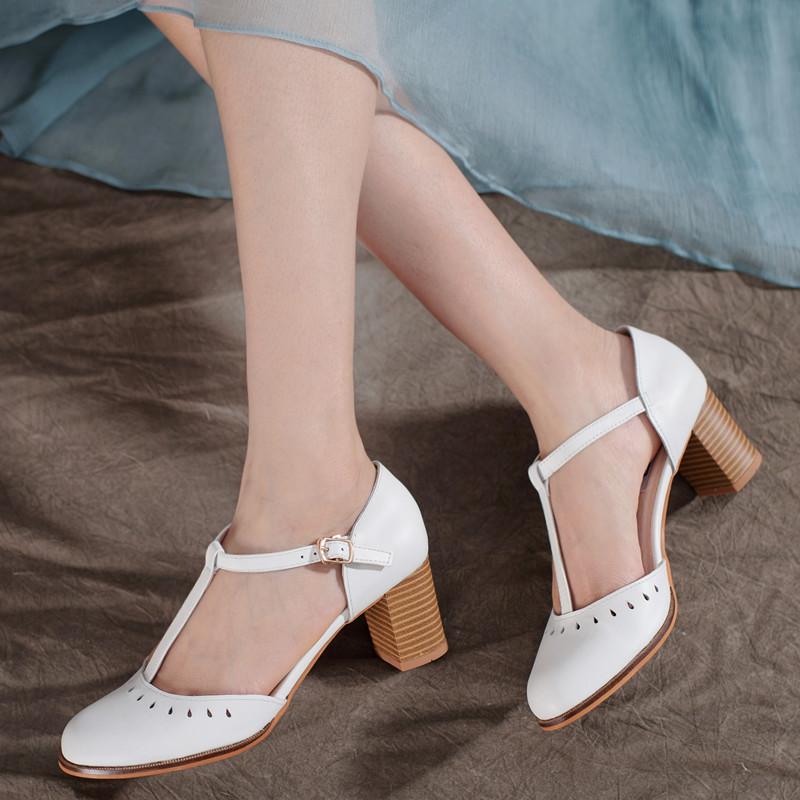 林印象英伦复古OL工作女鞋简约真皮镂空扣带粗跟凉鞋通勤单鞋