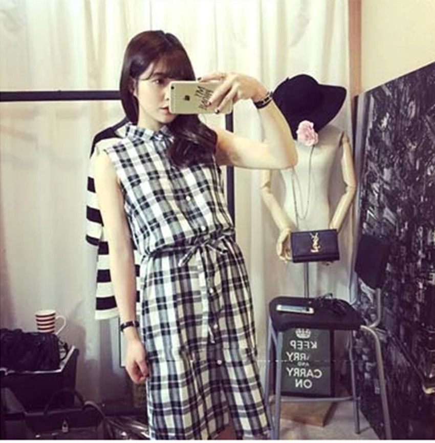 2015韩版新款宽松显瘦棉麻格纹无袖中长款连衣裙甜美学院风长裙