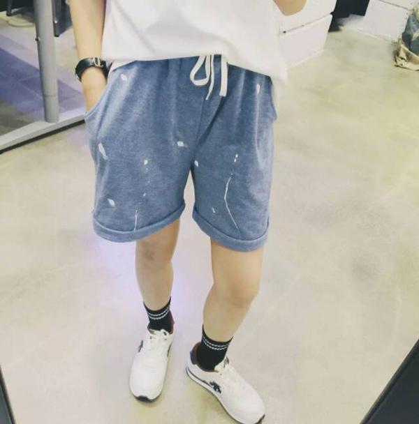韩国订单 ulzzang港风漆点做旧边休闲系带松紧腰短裤热裤