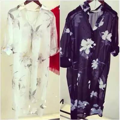 2015夏季新款韩系复古度假出游款宽松花朵图案中长款雪纺衫防晒衫$65