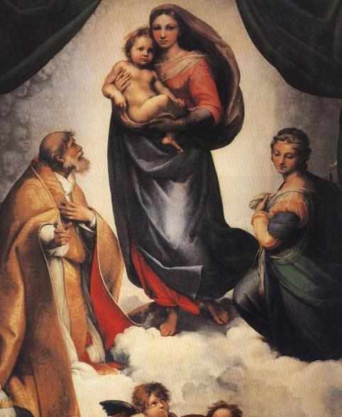 【西斯廷圣母】 西斯廷圣母为拉斐尔圣母像中的代表作,它以甜美、悠然的抒情风格而闻名遐迩。至1574年,一直保存在西斯廷教堂里,故得此名。现为德国德累斯顿茨温格博物馆古代艺术大师馆收藏。拉斐尔:(1483-1520)是文艺复兴意大利艺坛三杰之一. 他没有达芬奇那样经验丰富博学深思,也没有米开朗基罗 的雄强伟健的英雄气概.可是他虽然只活了三十七岁,却成为文艺复兴盛期最红的油画家.