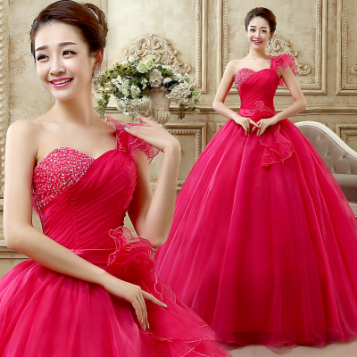 【婚纱礼服 玫红 粉色单肩演出服】