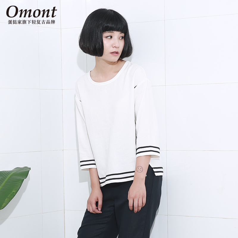 omont蛋挞家 宽松条纹边纯棉圆领七分袖T恤女夏 简约修身显瘦上衣