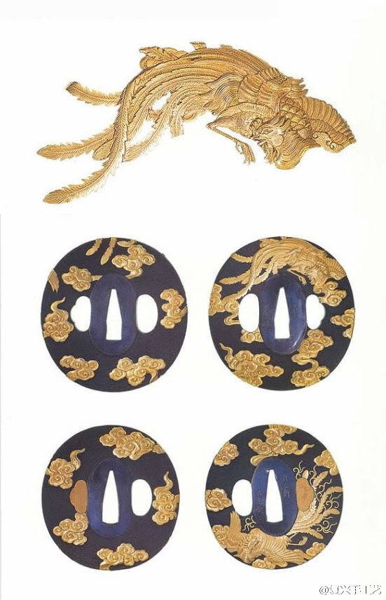 鐔是刀的护手,有丸形、角形、木瓜形,中间有一个让刀身通过的孔,左右两边还有为“小刀”和“笄”设置的小孔。使用者可以在刀不出鞘的情况下取出小柄和笄。
