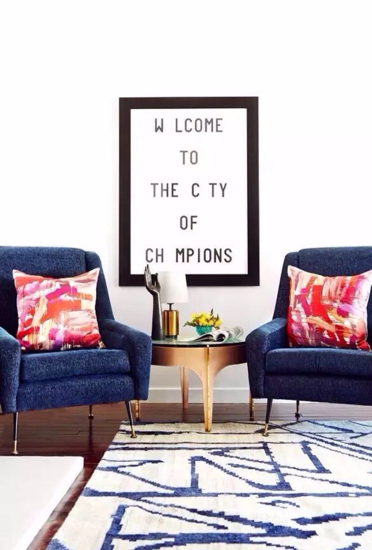她的家现代、时尚、简约,就如她的处事风格,果断干练,总有自己的想法,整个空间色调为白色,深海蓝的沙发与蓝色纹理的地毯,二者呼应,壁炉为黑白两色,酷劲十足。